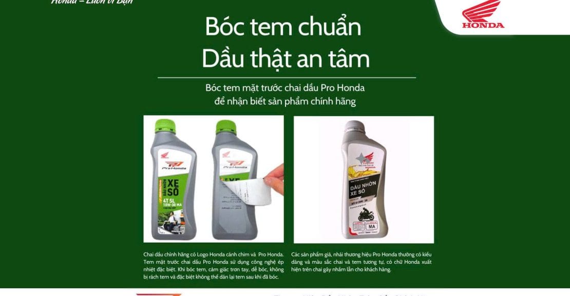 Khách hàng có thể nhận biết các sản phẩm dầu nhờn xe máy đóng chai thương hiệu Pro Honda chính hãng trên thị trường bằng cách Bóc tem mặt trước chai dầu. Tem mặt trước các chai dầu thương hiệu Pro Honda sử dụng công nghệ ép nhiệt đặc biệt (không dùng keo dán). Khi bóc tem, cảm giác trơn tay, dễ bóc, không bị rách tem và đặc biệt không thể dán lại tem sau khi đã bóc.